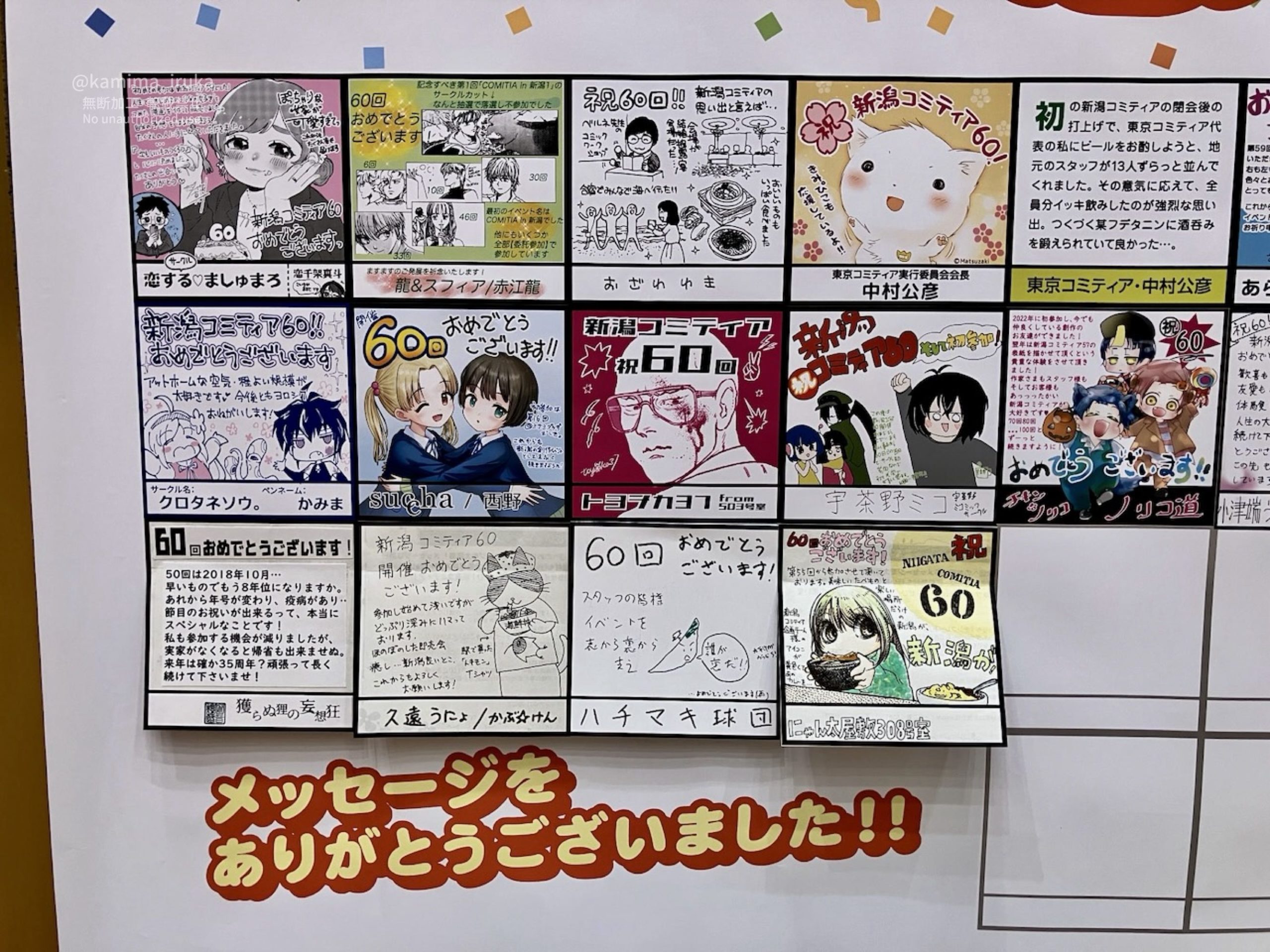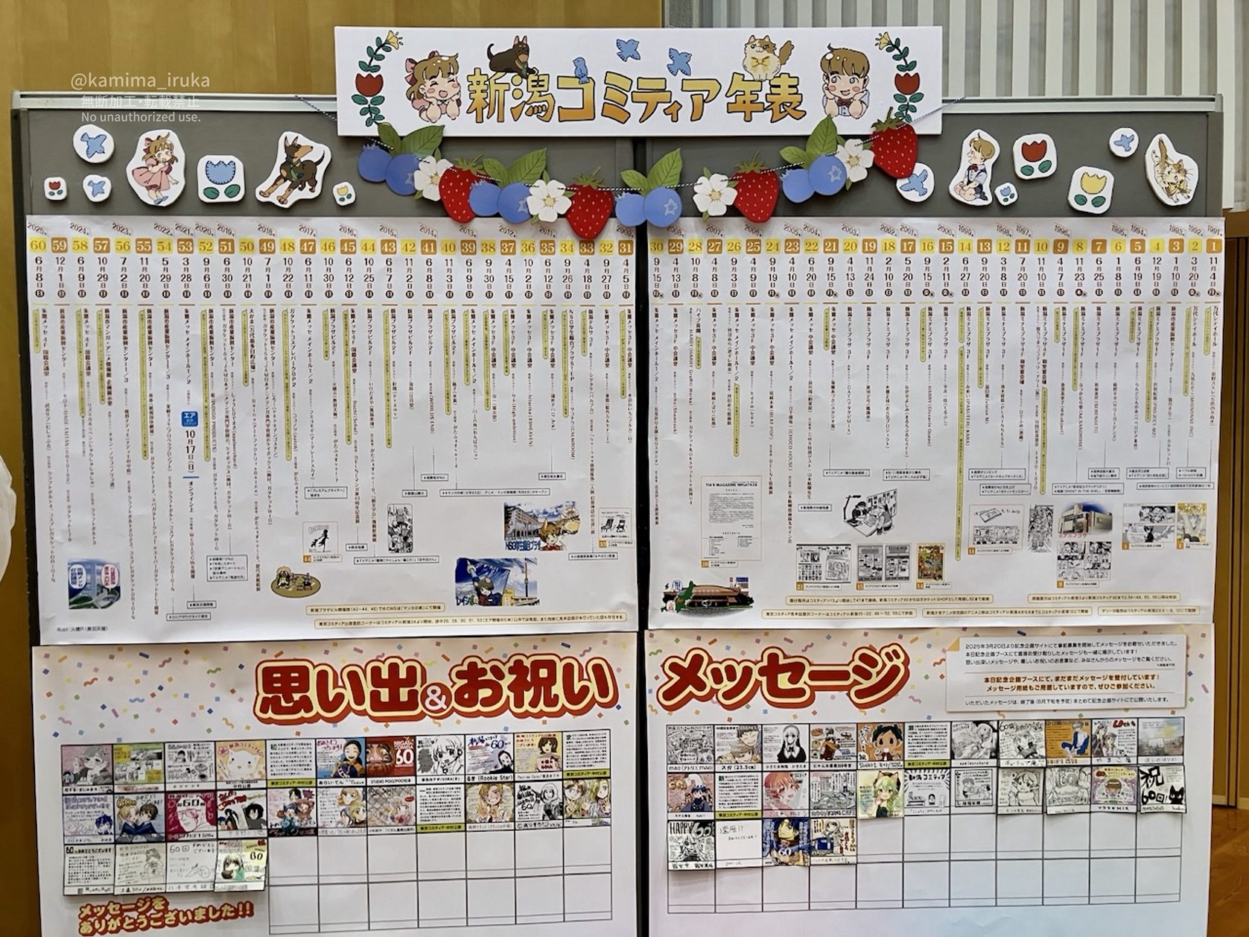 会場内では、新潟コミティアのあゆみを示した「新潟コミティア年表」(第1回開催は1991年!)や「お祝い&思い出メッセージ」の展示がされていたり…。